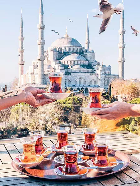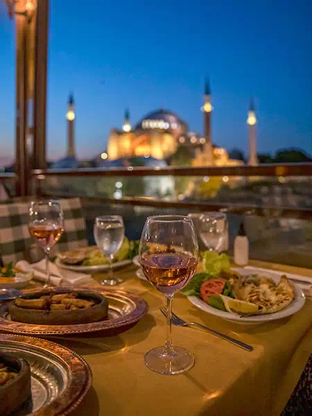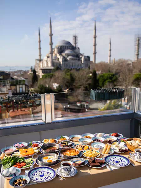 <p>Our unique restaurant is situated on a terrace ovgerlooking arguably the best view of magical Sultanahmet.Enjoying a glass of wine or a delicious meal from our Turkish and International kitchen, you can watch the sunset over St Sophia,Topkapi Palace and the Blue Mosque all just moments away.As boats slıj by on the Marmara Sea and myriad lights twinkle on the Bosphorus shore, you can choose (from an array of delicious meals) a deliciousmeal from an array of Turkish and International cuisine.</p>
